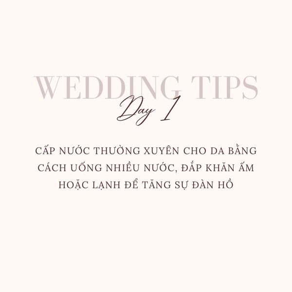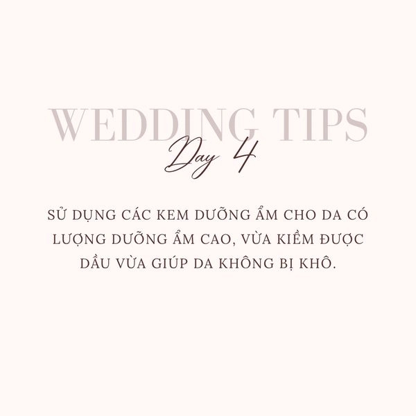 Dưỡng ẩm cho da là việc vô cùng quan trọng để có được một lớp make-up đẹp. Đặc biệt trong thời tiết lạnh, nếu da không đủ ẩm sẽ dẫn tới bị khô, bong tróc dẫn đến lớp make up bị mốc, sần sùi; còn trời nóng thì da thiếu ẩm sẽ tiết dầu khiến trang điểm bị bết và khi đổ dầu sẽ bị trôi. Nếu các bạn quá bận chuẩn bị cho đám cưới, hãy dành chút thời gian 4 ngày trước khi cưới dưỡng ẩm cho làn da để có thể đạt được hiệu quả tốt nhất nhé.