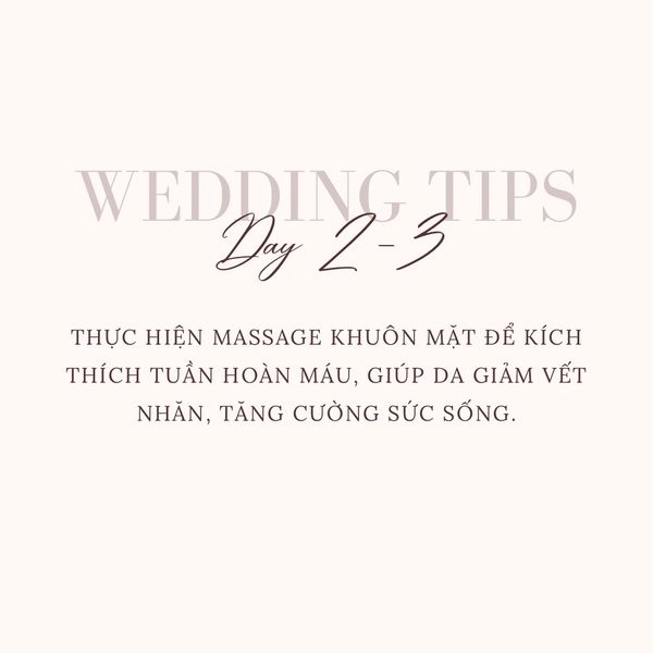 Thời điểm quan trọng và khá "gấp rút" với các cặp đôi rồi, nhưng đây cũng là thời điểm thích hợp để thực hiện các bài massage khuôn mặt giúp kích thích tuần hoàn máu. Những bài tập này không chỉ giúp da giảm vết nhăn mà còn khiến bạn tươi tắn, tràn đầy sức sống. Điều này cũng giúp bạn thư giãn, thả lỏng và thoải mái hơn sau 1 thời gian vất vả chuẩn bị cho ngày trọng đại.