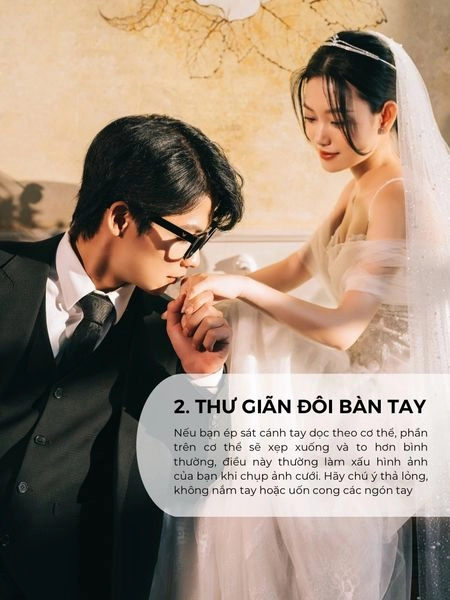 Với những bạn không quen pose dáng sẽ cảm thấy tay mình trở nên “thừa thãi” vì không biết để đâu và sẽ thường ép sát cánh tay dọc theo cơ thể khiến phần trên của người bị xẹp xuống và to hơn bình thường vì thế tư thế trở nên cứng nhắc và thiếu tự nhiên. Hãy chú ý thả lỏng, không nắm chặt tay và có thể tạo 1 số dáng với tay như: dùng tay che miệng cười, chú rể hôn tay cô dâu, cô dâu chú rể nắm tay nhau…