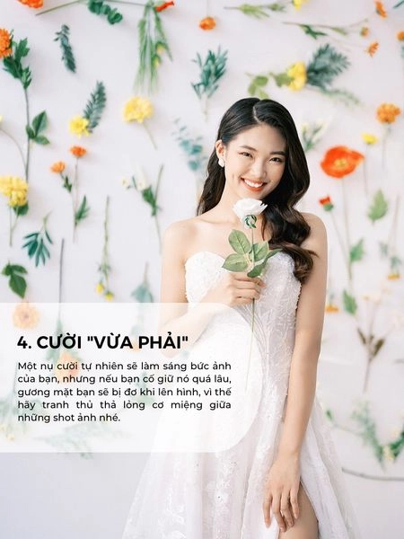 Một mẹo nhỏ cho các dâu rể là hãy tập cười trước khi chụp để biết được “nụ cười” khiến bản thân xinh xắn nhất nhưng vẫn thật tự nhiên nha. Một nụ cười tự nhiên sẽ giúp bức hình toả sáng nhưng cười lâu sẽ dễ khiến khuôn miệng bị đơ và trở nên gượng gạo. Hãy đổi sang các kiểu cười mỉm, cười nhẹ và “tranh thủ” thả lỏng cơ miệng giữa các shot ảnh nhé.