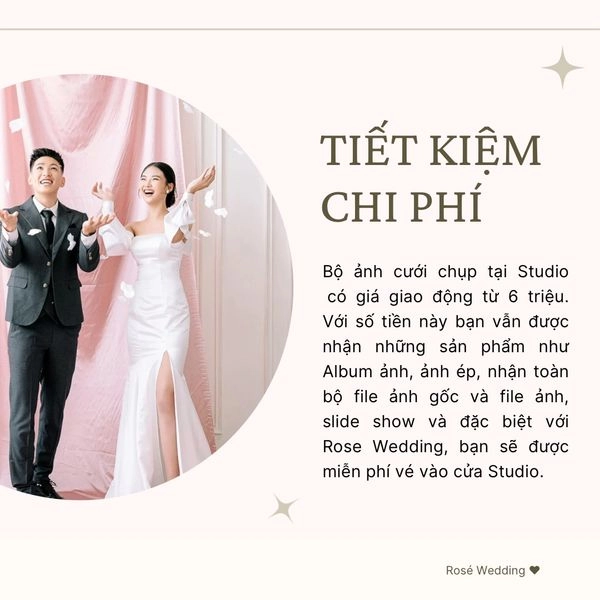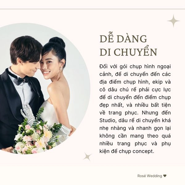 Chụp ngoại cảnh, các cặp đôi sẽ phải di chuyển xa và vất vả hơn khi chụp tại Studio dẫn đến một số rủi ro, bất tiện như: quên đồ hay gặp sự cố. Các Studio đều ở trung tâm vì thế việc đi lại rất thuận tiện và cũng không cần mang theo nhiều đồ cũng như phụ kiện. Chụp tại Studio còn dễ dàng hơn cho thợ make up, take care trong việc chuẩn bị nữa đó!