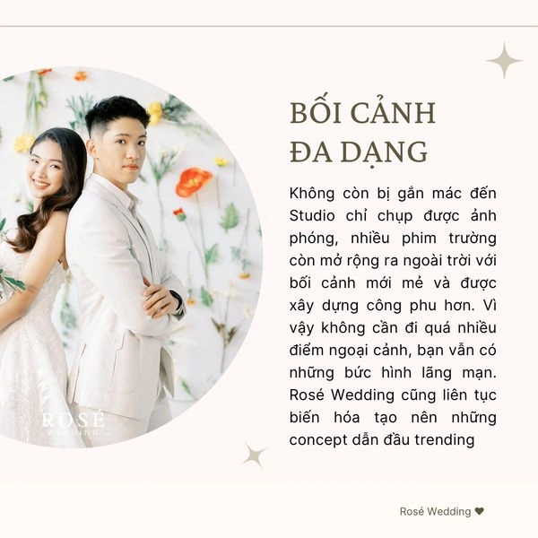 Nếu chụp ngoại cảnh phải phụ thuộc vào cảnh vật xung quanh thì tại Studio các cặp đôi có thể thoả thích set up background theo Concept mong muốn của mình. Nhiều phim trường còn mở rộng ra ngoài trời với bối cảnh mới mẻ được xây dựng vô cùng công phu. Có thể set up theo mong muốn vì thế mỗi bộ ảnh cuới sẽ mang tính cá nhân hoá cao và không bị trùng lặp.
