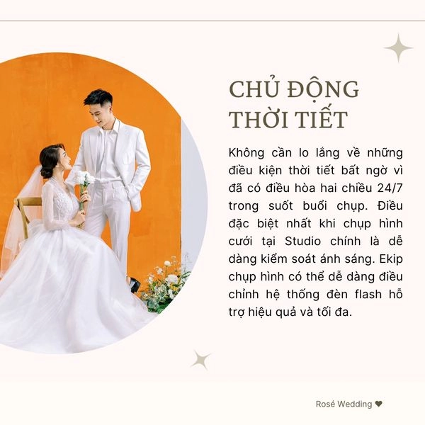 Không cần lo lắng về thời tiết xấu sẽ ảnh hưởng đến ảnh chụp vì trong Studio luôn có điều hoà, ánh sáng đầy đủ. Chụp ảnh cưới tại Studio sẽ dễ dàng hơn trong việc kiểm soát ánh sáng, điều này sẽ giúp đảm bảo chất lượng cho bộ ảnh.