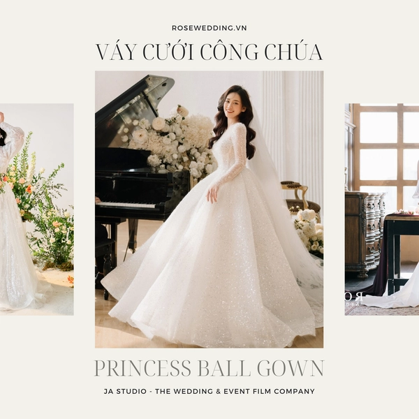 Được thiết kế để tôn vinh vẻ đẹp và thanh lịch của cô dâu, váy cưới công chúa mang đến cảm giác lộng lẫy, sang trọng và hoàng gia. Váy có thiết kế xòe rộng từ eo xuống, tạo hình dáng như váy cổ tích của công chúa. Được chế tác từ vải tulle, lụa hoặc satin, váy tạo nên vẻ lộng lẫy, sang trọng và hoàng gia. Điểm nhấn của váy công chúa thường là thiết kế cổ tim hoặc xẻ tà lớn, giúp cô dâu trông trang nhã và quyến rũ.