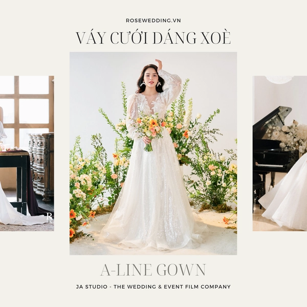 Váy cưới xoè là một trong những mẫu váy cưới tinh tế và dịu dàng. Được thiết kế với dáng xòe từ eo xuống chân, tạo hình dáng giống chữ "A", váy cưới xòe mang đến vẻ đẹp thanh lịch, duyên dáng và đặc biệt phù hợp với nhiều phong cách và vóc dáng của cô dâu. Váy cưới xoè thường được làm từ các chất liệu như satin, lụa hoặc chiffon. Đây là mẫu váy phổ biến và dễ mặc, phù hợp với nhiều phong cách và vóc dáng của cô dâu.